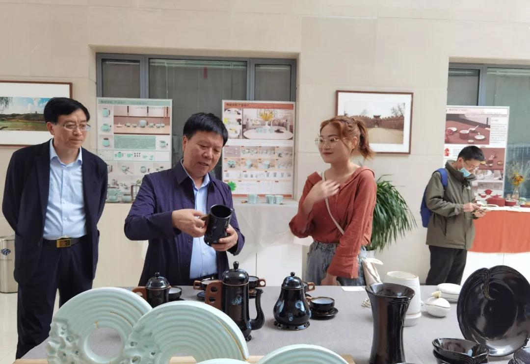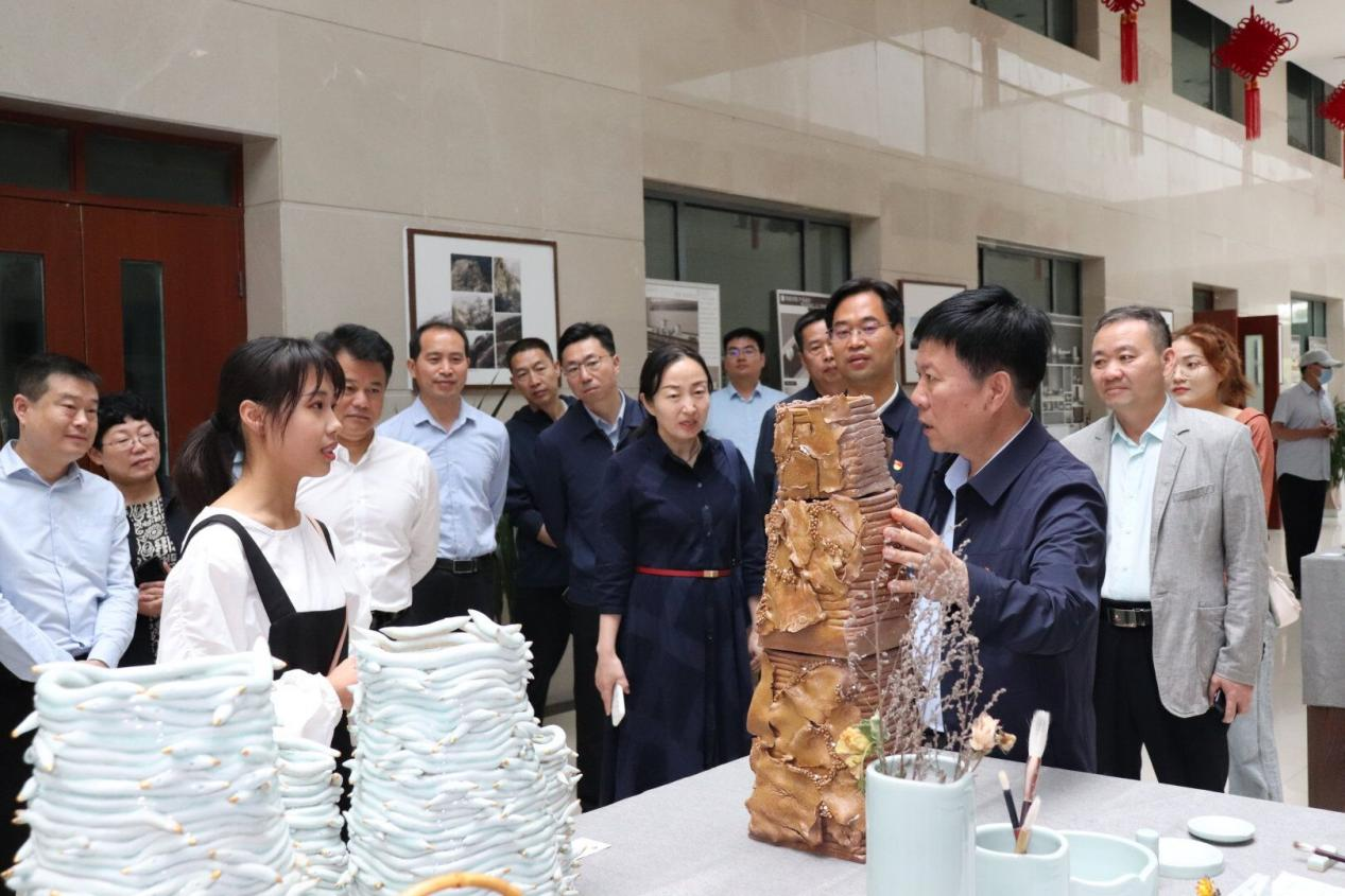 在参观过程中,周斌认真倾听不同作者对自己作品创作过程的讲解,还不时询问他们在创作过程中的细节,了解各类作品的创作背景、文化内涵、市场前景,对学生和指导老师的辛勤创作给予了很高的评价,连连称好!周斌指出,陶瓷及艺术设计类专业要坚持产教融合,以本地文化传统为出发点继承和发扬传统文化,做到立足于本地,与时代同步,将教学过程与产品生产和销售对接,打开文创作品的销路。他还现场要求相关政府管理部门要主动作为,积极为学校推广文创作品提供便利,将师生艺术创意作品引入各旅游景点,提升本地旅游景点的文化内涵和品味,同时激发师生艺术创作的灵感和激情。