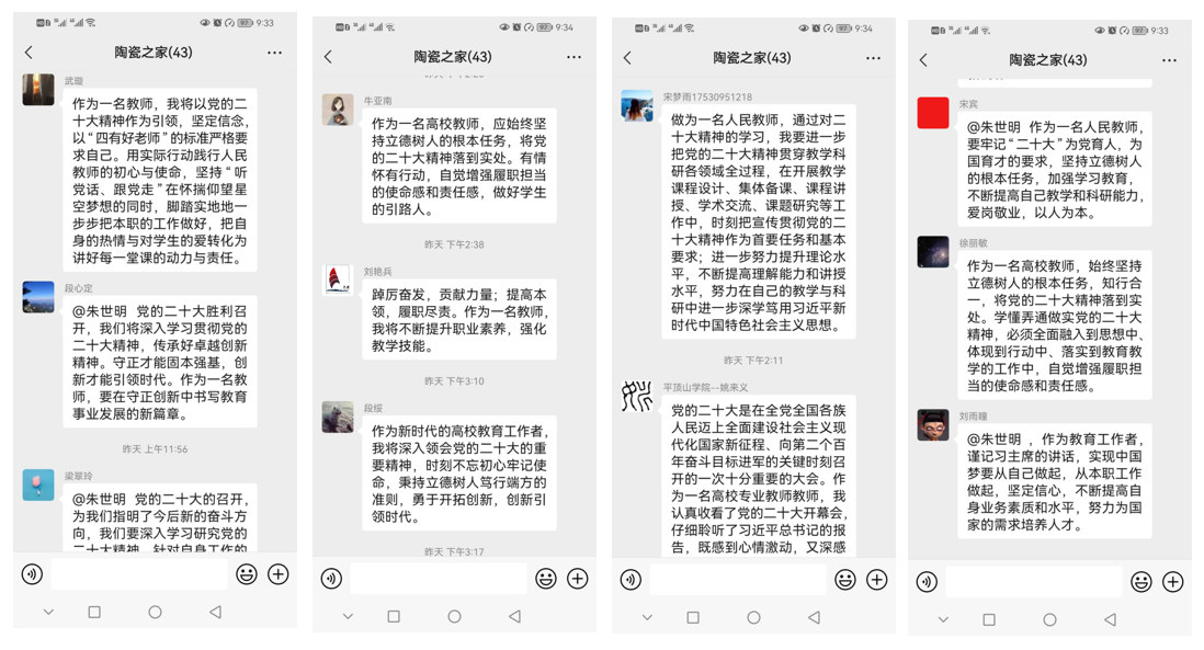 随后,各位教师通过线上、线下结合的方式,进行了个人学习感悟交流。大家纷纷表示,时刻不忘立德树人根本任务,争当新时代教育工作者的先行者和领头羊,努力为学院事业发展贡献自己的力量。