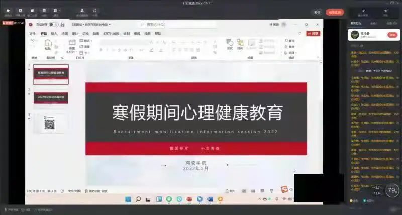 接下来,王培静老师通过针对假期同学们心理状况开展了寒假期间心理健康教育。同时,王培静老师希望同学们在开学前调整作息时间,走出信息沉溺,多读书,少游戏,帮助父母做一些力所能及的事情,合理规划学习生活。会议最后,王培静老师开展2022年征兵动员宣讲会,详细解读了最新大学生参军入伍的优惠政策,希望同学们积极响应政策,增强大学生国防意识、爱国意识、点燃参军热情。