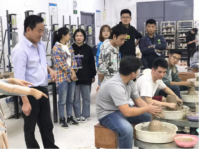 王老师向同学们讲解不同器型的拉坯技巧,同学们听得聚精会神。