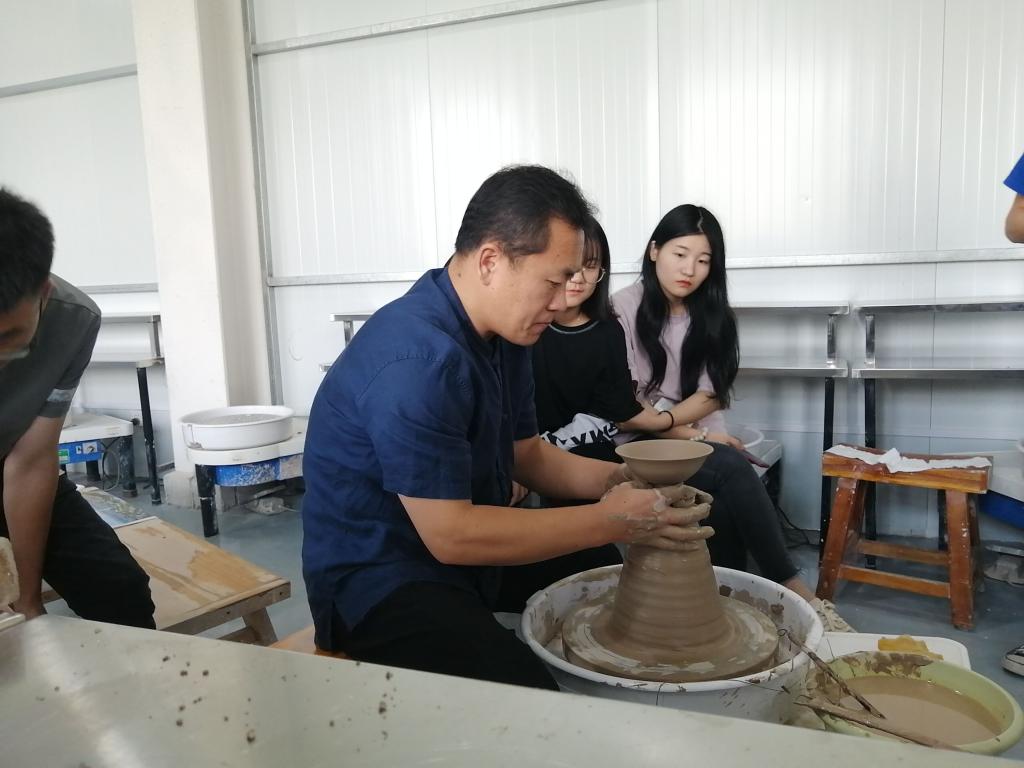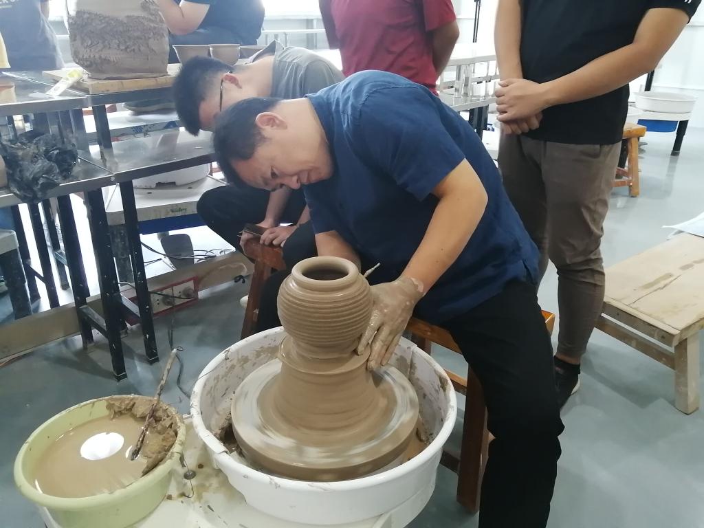 讲座结束后,李闻雷教授在WilliamHill威廉希尔实训创作工场向同学们展示拉坯技术,分享自己的独特技巧,并与同学们进行技术交流。