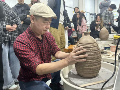 随后,曲教授边讲解边演示了拉坯技法。他熟练地揉捏陶泥,凭借敏锐的触感,精准控制陶坯的厚度和重量,迅速创作出陶器作品。他向同学们阐述了自己对陶瓷技艺的理解,同学们也在实践中感受到了陶艺的乐趣。